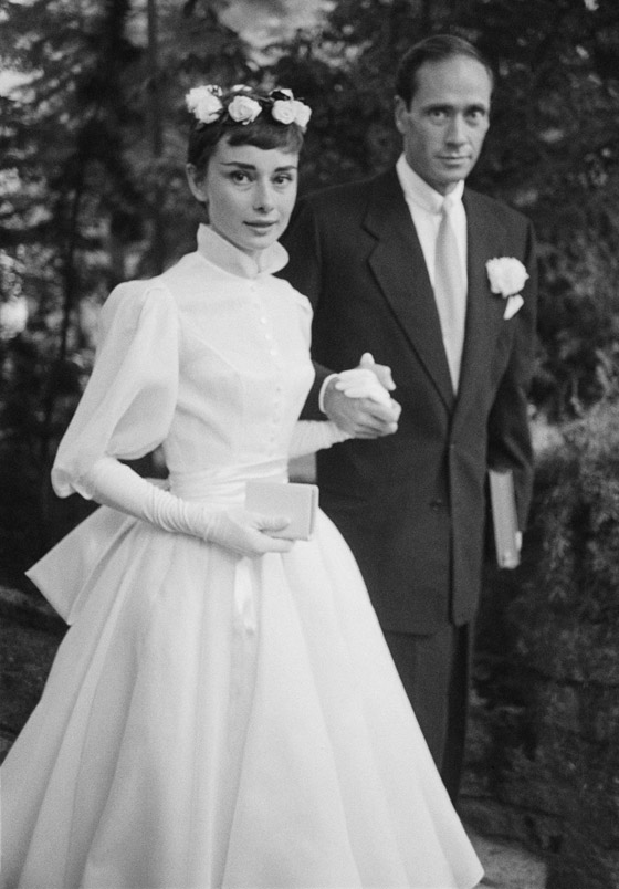 4. فستان زفاف أودري هيبورن: لطالما كانت الممثلة البريطانية أودري هيبورن أيقونة للموضة والأناقة، وقد تجسدت أناقتها في حفل زفافها من الممثل ميل فيرير الذي أقيم في سويسرا عام 1954. ارتدت العروس فستاناً طويلاً من تصميم بيير بالمين، وتميز الفستان المصمم على نمط الستينيات برقبة عالية وأكمام طويلة، وقد استبدلت أودري الطرحة بالزهور على رأسها.