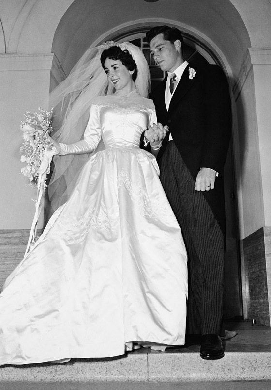 5. فستان زفاف إليزابيث تايلور: في الواقع لقد تزوجت الممثلة الحاصلة على الجنسيتين البريطانية والأمريكية والملقبة بـ"قطة هوليوود المدللة"، إليزابيث تايلور، سبع مرات، وفي كل مرة اختارت تصميماً مختلفاً ومميزاً لفستان زفافها. فعندما تزوجت من ريتشارد بيرتون في فندق ريتز كارلتون في مونتريال عام 1964، اختارت ارتداء فستان قصير من الشيفون الأصفر بدل ارتداء الأبيض التقليدي. وعندما تزوجت من زوجها الرابع المغني إدي فيشر في لاس فيغاس عام 1959، ارتدت فستاناً أنيقاً أخضر اللون. لكن قبل ذلك، عندما تزوجت في عام 1950 من كونراد هيلتون "نيكي" في بيفرلي هيلز، ارتدت فستاناً أبيض أيقونياً من تصميم هيلين روز التي كانت معروفة على أنها أشهر مصممات الأزياء في هوليوود آنذاك.