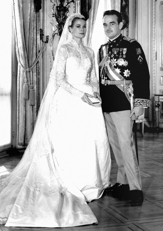 6. فستان زفاف غريس كيللي: تزوجت الممثلة الأمريكية الفاتنة غريس كيللي من رينييه الثالث أمير موناكو في كاتدرائية سانت نيكولاس عام 1956. ولا يزال فستان زفافها محفوراً في ذاكرة الكثيرين إلى اليوم، حتى أنه شكل مصدر إلهام لفستان زفاف كيت ميدلتون دوقة كامبريدج. إذ ارتدت كيللي فستاناً من التفتا الحريري يتوسطه حزام الدانتيل من بروكسل من تصميم مصممة الأزياء المشهورة هيلين روز.