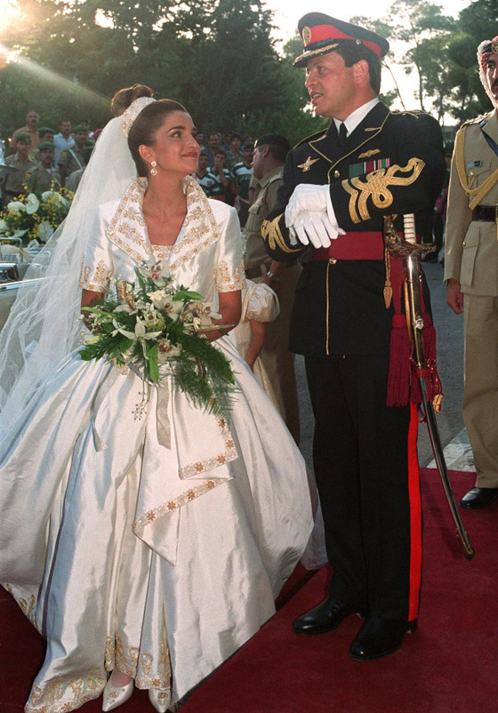 10. فستان زفاف الملكة رانيا: أقيم حفل زفاف الملكة رانيا وزوجها العاهل الأردني الملك عبدالله الثاني في قصر الزهران في عام 1993. وقد ارتدت الملكة حينها فستاناً مميزاً من تصميم البريطاني بروس أولدفيلد الذي اشتهر في ذلك الوقت بتصاميمه الفريدة لليدي ديانا.