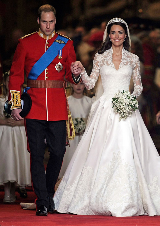 11. فستان زفاف كيت ميدلتون: تزوجت كيت ميدلتون من الأمير ويليام في دير وستمنستر في 2011، لتصبح بذلك دوقة كامبريدج. وارتدت ميدلتون فستاناً من الساتان باللون الأبيض العاجي بأكمام طويلة. أما الطرحة فقد كانت من التول العاجي أيضاً، وتمت استعارة التاج من الملكة إليزابيث.