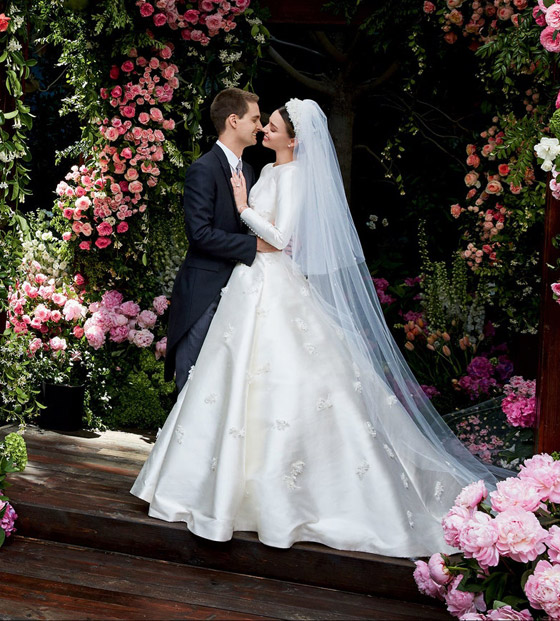 14. فستان زفاف ميراندا كير: تزوجت عارضة أزياء فيكتوريا سيكريت ميراندا كير من مؤسس Snapchat إيفان شبيغل في لوس أنجلوس عام 2016. واستوحت فستانها من الفستان الأيقوني الذي ارتدته غريس كيلي، إذ اختارت كير فستاناً رزيناً ذا ياقة عالية وأكمام طويلة من Dior.