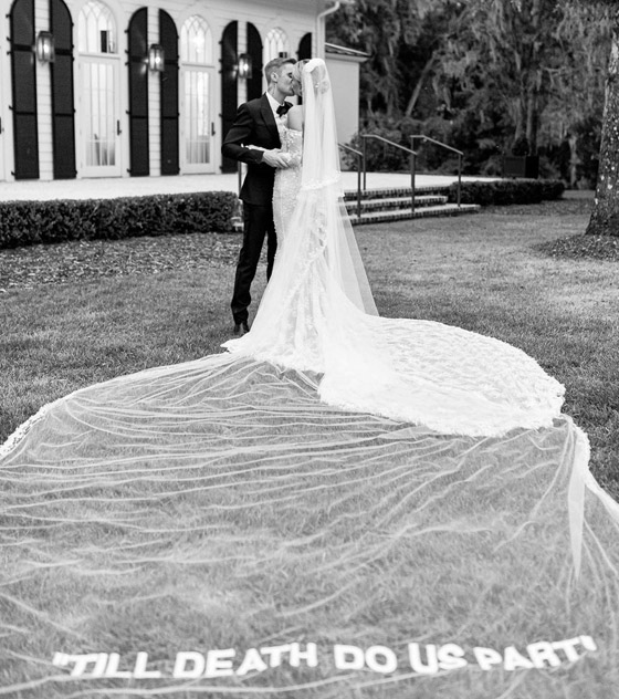 16. فستان زفاف هايلي بيبر: تزوجت هيلي بالدوين من المغني جاستن بيبر في حفل أقيم على مدى عدة أيام في عام 2019. واختارت العروس أربعة أثواب للزفاف، كان أبرزها الفستان من توقيع ماركة Off White، واختارت طرحة طويلة كُتبت عليها عبارة "لا يفرقنا سوى الموت".