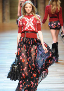 - ارتدي تنورةً صيفيةً طويلة مزينة بطبعات الورود مع جاكيت صوفية خفيفة وطويلة وزيني الإطلالة بحزامٍ رفيعٍ عند الخصر. هذا اللوك المستوحى من السبعينات كان موجوداً بكثرة في مجموعات "D&G" و"Chanel" لموسم الربيع القادم. احرصي على أن تكون القطعة الفوقية بلونٍ محايدٍ وهادئ كالكاميل أو البيج أو البني.