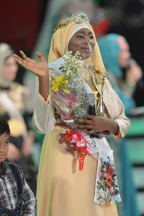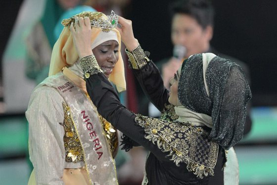 انتخبت الطالبة النيجيرية اوبابيي عائشة اجيبولا البالغة 21 عاما الاربعاء، "ملكة جمال المسلمات" وهي مسابقة تقام للمرة الاولى وقد فازت برحلة الى مكة المكرمة . وقد اجشهت الفائزة بالبكاء شأنها في ذلك شأن كل الفائزات بمسابقات الجمال في العالم، عند اعلان فوزها من قبل لجنة التحكيم. الا ان اجيبولا ركعت بعد ذلك وبدأت بالصلاة.