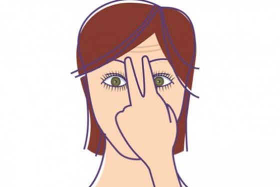 ضعي أصابعكِ فوق الحواجب، ثم قومي بعمل مساج خفيف لهذه المنطقة بحركات دائرية لطيفة، مع تحريك الرقبة إلى اليمين واليسار. كرري هذا التمرين لمدة دقيقة.
