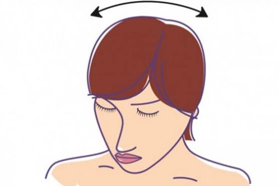 قومي بإغماض عينيكِ ثم تحريك الرأس والرقبة إلى الأسفل، والقيام بحركات دائرية خفيفة. كرري هذا التمرين لمدة دقيقة.