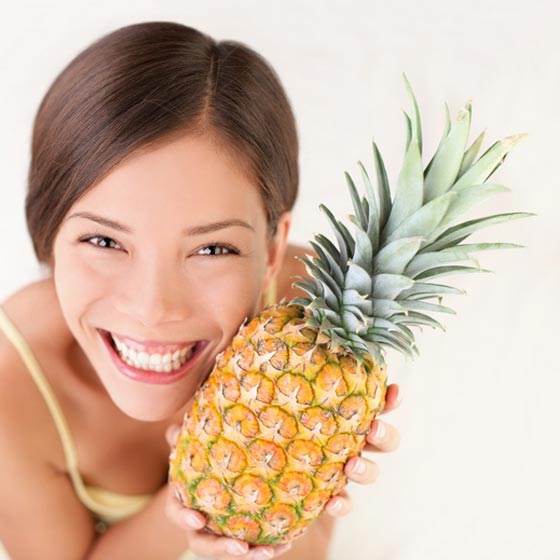 الأناناس لعلاج التجاعيد حول العين: يحتوي الأناناس على انزيم البروميلين، وهو عامل فعال في مكافحة الالتهابات وشكل طبيعي من حمض ألفا هيدروكسي التي يمكن أن يساعد في علاج التجاعيد. ضعي بعضاً من عصير الأناناس الطبيعي الطازج حول عينيك، واتركيه لمدة 20 دقيقة ثم اغسلي بالماء الفاتر. كرري الأمر يومياً لعلاج التجاعيد حول العين.