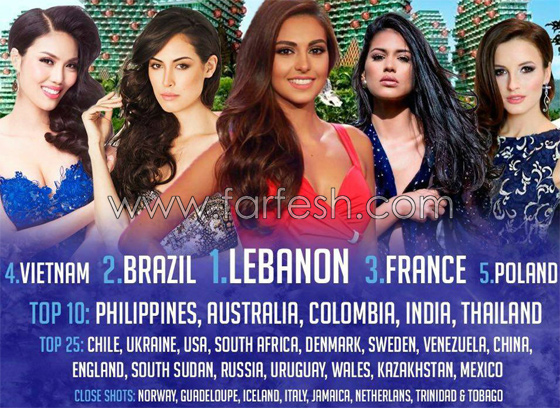 وجاءت ملكة جمال البرازيل في المرتبة الثانية تلتها ملكة جمال فرنسا ثم الفيتنام في المركز الرابع وبولندا في المركز الخامس. ومن المقرر أن تنشر لجنة تحكيم المسابقة نتائج الجولة الجديدة من التصويت في السابع من الشهر الجاري. وكانت فاليري أبو شقرا البالغة من العمر 23 عاما قد توجت ملكة جمال لبنان للعام 2015 في أكتوبر/تشرين الأول الماضي.