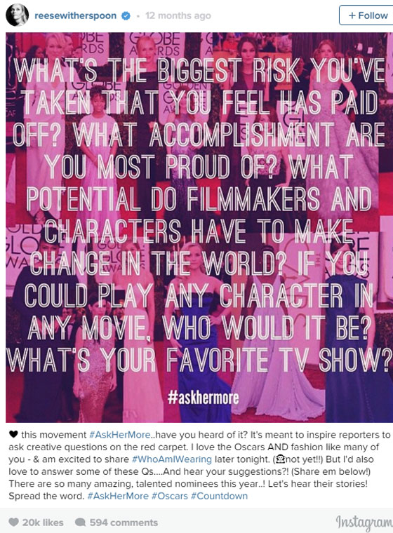 7. #AskHerMore: هذه الحملة كانت موجهة بالتحديد للصحفيين ليوجهوا أسئلة أكثر عمقا للممثلات، تتعدى فكرة السؤال عن الفستان أو المكياج أو الاكسسوارات.