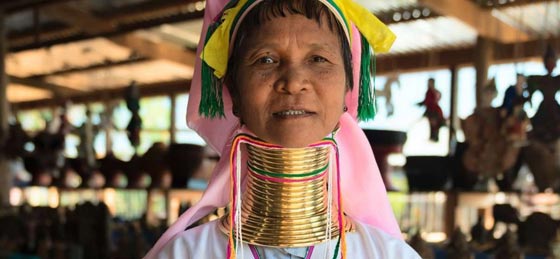 قبيلة كايان بتيلاند.. الرقبة الطويلة الرقبة الطويلة تعتبر من مميزات الجمال فى قبيلة كايان التايلاندية، حيث يتم إلباس الفتيات من عمر خمس سنوات حلقات معدنية حول رقابهن وزيادة العدد تدريجيا مع مرور السنوات للوصول إلى الرقبة الطويلة والتى تعتبر أيضا من معايير الأناقة.