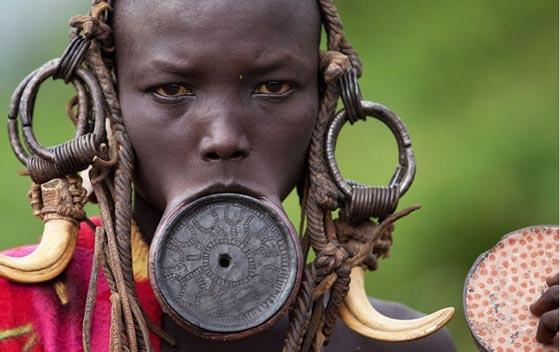 إثيوبيا: وضع طبق من الفخار داخل فم المرأة فى أثيوبيا ليتمدد بشكل تدريجى، حيث يعتبر الفم الكبير من علامات الجاذبية لدى جماعة مرسى فى إثيوبيا الجنوبية.