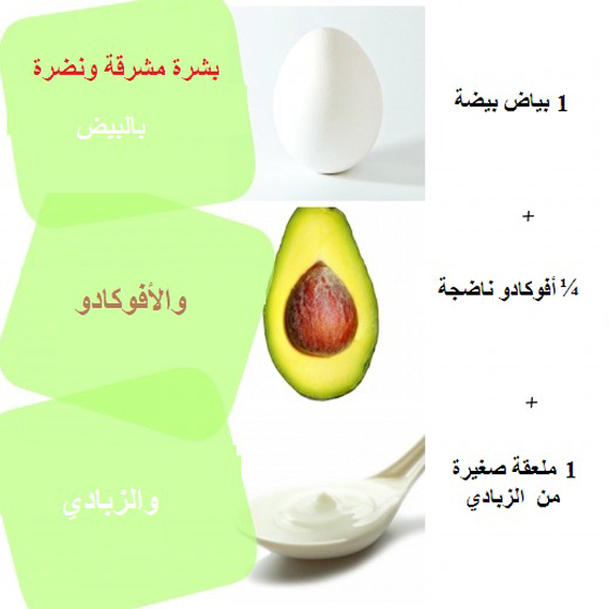 لاحتوائه على حمض اللبنيك، وبروتينات ومغذيات مرطبة، يمنح قناع البيض بالزبادي والأفوكادو نعومة فائقة وملمسا حريريا، ولتحضير القناع امزجي بياض بيضة مع ملعقة كبيرة من الأفوكادو المهروسة وملعقة مماثلة من الزبادي، حتى تتكون عجينة ناعمة، ثم قومي بفردها على وجهك، وبعد أن تجف تماماً، اغسليها بالماء.