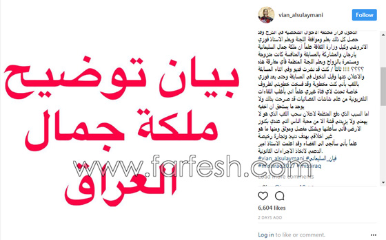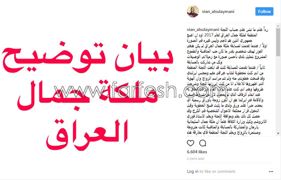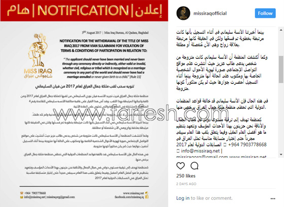 هددت ملكة جمال العراق "فيان عامر نوري السليماني" ضد منظمة ملكة جمال العراق التي جردتها من لقبها ومن واجباتها المرتبطة بهذا اللقب، بعد اكتشاف أنها مطلقة، وكذبت على اللجنة وأخفت انها كانت متزوجة وقالت انها كانت مخطوبة وانفصلت عن خطيبها، بينما تقول اللجنة انها متزوجة او كانت متزوجة من "طالب عزيز" وهو عراقي يحمل الجنسية الأيرلندية، بحسب صورة من بطاقة هوية فيان التي تم نشرها في مواقع التواصل الاجتماعي...