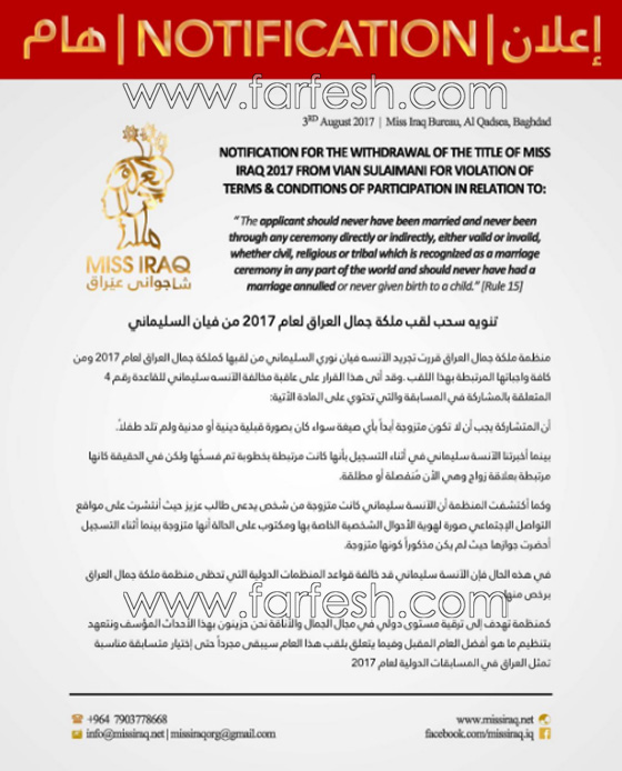 وجاء في بيان المنظمة، أن "القرار اتخذ بعد مخالفة الآنسة فيان سليماني لقواعد المسابقة والتي توجب على المشاركة ألا تكون متزوجة. سليماني قالت أثناء التسجيل إنها كانت مرتبطة بخطوبة تم فسخها، لكنها في الحقيقة كانت مرتبطة بعلاقة زواج من شخص يدعى طالب عزيز، وهي الآن منفصلة أو مطلقة. في هذه الحالة فإن سليماني خالفت قواعد المنظمات الدولية التي تحظى منظمة ملكة جمال العراق برخصة منها، وفيما يتعلق بلقب هذا العام سيبقى مجردا حتى اختيار متسابقة مناسبة تمثل العراق في المسابقات الدولية".