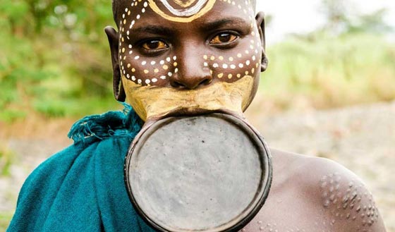 5- قبيلتي مورسي وسورما — أفريقيا: تثبت نساء هذه القبائل الأفريقية أطباق صغيرة في شفاههن السفلية، وتتم إزالة هذه الأطباث مع بلوغ الفتيات سن البلوغ، حيث تتم إزالة سنين من الفك السفلي ثم تثقب شفاههن السفلية ويثبت بها طبقا جديدا.