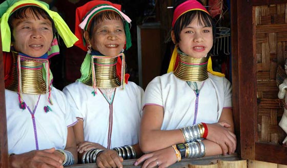 1- قبيلة كايان — بورما: في قبيلة كايان تعتبر العنق الطويلة لدى النساء دليل على جمالهن، لذلك تحرص فتيات القبيلة على إطالة أعناقهن منذ نعومة أظفارهن عن طريق وضع عدد من الحلقات المعدنية حول عنق الفتاة مع زيادة عدد تلك الحلقات لإطالة الرقبة مع تقدم سن الفتاة.