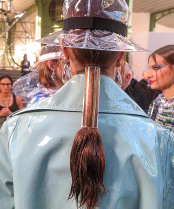 اكسسوارات البلاستيك الشفافة على الشعر: بعد أن انتشرت موضة الأحذية الشفافة. ابتكرت شانيل اكسسوارات بلاستيكية شفافة على الشعر. يمكنكِ ارتداء القبعة الشفافة، أو تسريح شعركِ على شكل ذيل ولفّه بالبلاستيك الشفاف.