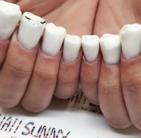 بعد انتشار موضة أظافر الفراء، جاء تحدي جديد لتصميم الأظافر على شكل الأضراس والأسنان ليكسر جميع القواعد. استوحى حساب روسي متخصص في فن الأظافر عبر إنستجرام تصميما جديدا للأظافر مستوحى من الأسنان، وحقق مقطع فيديو للموضة الجديد ما يقرب من 350 ألف مشاهدة في غضون يومين فقط.