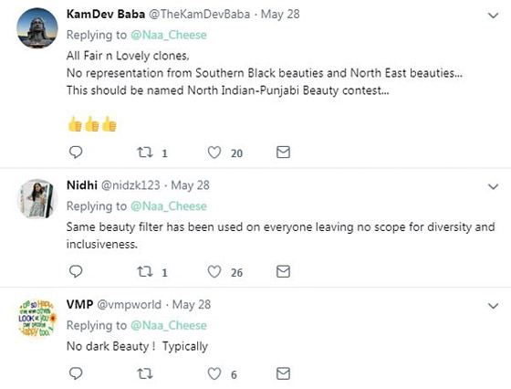 وعلى موقع تويتر، شارك المستخدم "لو براون جيمس" صورة من الصحيفة وأرفقها بتعليق ساخر، متسائلا: "ما الخطأ في هذه الصورة؟". وأثار السؤال عشرات الردود التي جاءت أغلبها بأن "كل النساء بيضاوات"، فيما رد أحد المستخدمين قائلا: "ثمة كثير من البياض هنا". وسخر مستخدمون آخرون لموقع تويتر، من أن صور المرشحات أقرب إلى إعلان لـ"كريم تبييض البشرة"، بسبب لون البشرة الفاتح. ومن يرى صور المرشحات النهائيات للمسابقة، يجد تشابها كبيرا فيما بينهن من حيث اللون والشكل تقريبا وحتى المكياج.