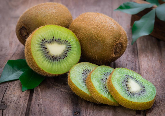 9- الكيوي: يُعتبر الكيوي أحد أكثر أنواع الفاكهة غنى بالفيتامين C الذي ينشّط إنتاج الكولاجين في البشرة ويؤخّر التجاعيد كما يعيد للجلد ليونته المفقودة.