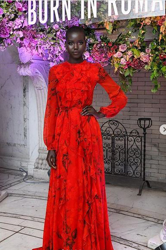 وإرتدت Akech ثوباً من تصميم فالنتينو هوت كوتور، وقد صممّه لها خصيصاً المدير الفني في الدار Pierpaolo Piccioli. الفستان كان مميزاً بطيّاته عند الصدر، وشقه العالي، وقد زيّنته العارضة بأكسسوارات، وحقيبة تحمل شعار "V" علامة الماركة الإيطالية.
