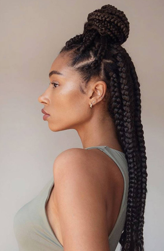 5- عقدة الشعر المرتفعة: تسريحة عقدة الشعر المرتفعة تجعل شعرك يبدو أكثر كثافة وتُريحك من الشعيرات القصيرة وتمنحكِ مظهراً حيوياً وعصرياً.