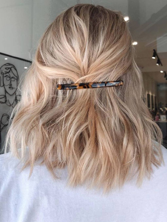 6- لف الشعر وربطه بالمشبك: لفي الجزء الأمامي من الشعر إلى الوراء ثم ثبتيه بمشبك الشعر. تبدو أنيقة وبسيطة. ويُمكنك ربطها بالطريقة البسيطة بعد لم الشعر أو استنباط إحدى هذه الأفكار التي تبدو تسريحات جديدة.