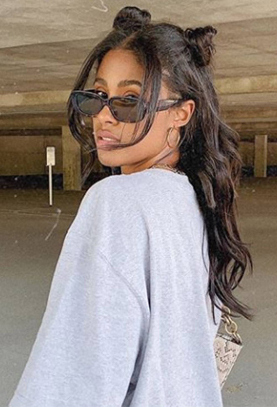 7- تسريحة الكعكتين: إنها تسريحة لطيفة ومثالية للصيف. قسمي شعرك إلى قسمين ولفي جزءاً من كل قسم إلى كعكة صغيرة على كلا الجانبين. ولجعلها تبدو أكثر عشوائية، اسحبي بعض الشعر الموجود في مقدمة الرأس.