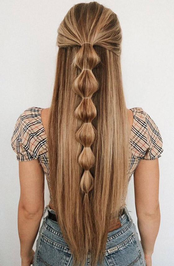 9- الجدائل الفقاعية: التسريحة المفضلة لهذا الموسم؛ اربطي شعركِ على شكل ذيل حصان، ثم اصنعي بعض الفقاعات الإضافية بالذيل باستخدام أستك الشعر الصغير.