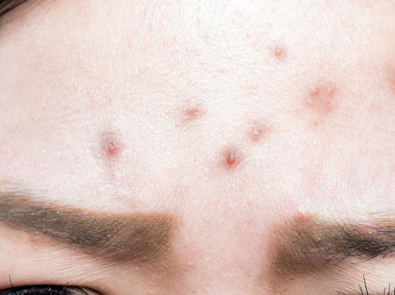 1- حَب الشباب: قد يكون حَب الشباب أسهل أنواع التشخيص، والذي تتدرج علاماته بدايةً من الرؤوس السوداء والرؤوس البيضاء إلى البثور والدمامل. كما ستبدو البقع التي تظهر على جبهة ووجه الشخص مشابهة لتلك التي تظهر في أي مكان بالجسم. ويقول جوشوا زيشنر، طبيب الأمراض الجلدية المعتمد من المجلس الأمريكي للأمراض الجلدية: "يؤدي تراكم الزيوت داخل الغدد الدهنية إلى انسداد المسام، الأمر الذي يؤدي إلى حدوث الالتهاب وظهور البثور".