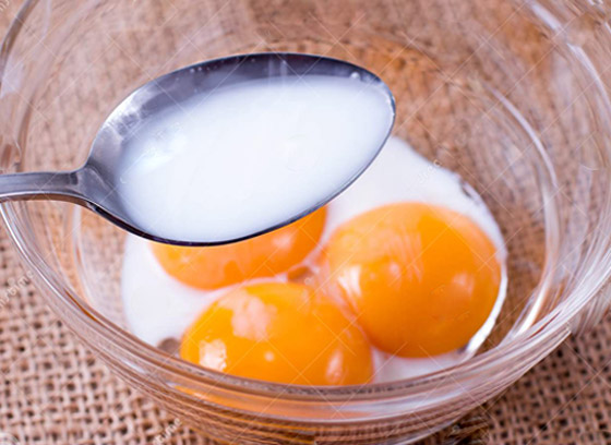 1. نضع صفار البيض في وعاء ونضيف إليه الحليب ونمزج المكونين معًا إلى أن يتجانس كل منهم مع الآخر.