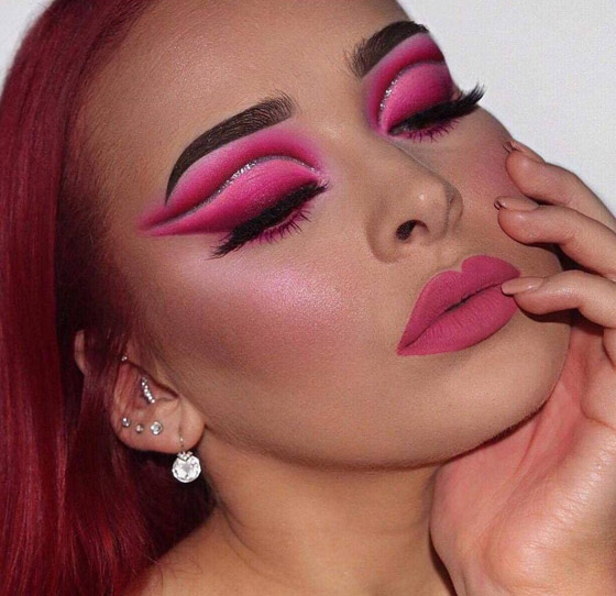 • طبّقي ظلال العيون باللون الزهري المتوسط، بشكل ممتد حول حدود الجفن المتحرك تقريباً وحتى آخر العين. إلجئي إلى أسلوب الـ Cut Crease واستخدمي ظلال العيون الوردية الداكنة على حافة الجفن المتحرك ووصولاً إلى زاوية العين الخارجية. استخدمي درجة فاتحة جداً من ظلال العيون الوردية المائلة إلى البياض، وطبّقيها على الزاوية الداخلية من العين.