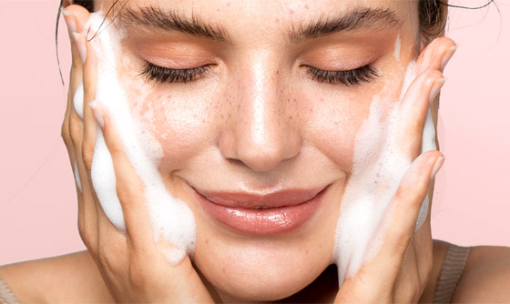 2- تنظيف الوجه: تلي هذه الخطوة إزالة الماكياج وهي تعتمد على استعمال صابون راغي مخصّص للوجه، يساهم في إزالة الشوائب من داخل المسام وعن سطح البشرة ويحضّرها لاستقبال مستحضرات العناية الأخرى.