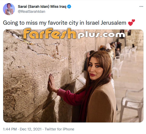 اختتمت سارة عيدان، ملكة جمال العراق السابقة، زيارة إلى إسرائيل بالوقوف أمام حائط البراق (الذي يطلق عليه الإسرائيليون حائط المبكى) في مدينة القدس الشرقية المحتلة. ونشرت عيدان صورة لها على حسابها بموقع "تويتر" من أمام الحائط، وعلقت بالقول: "سوف أفتقد مدينتي المفضلة في إسرائيل.. القدس".