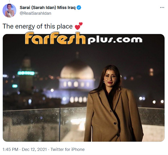 كما نشرت سارة صورة لها أمام المسجد الأقصى وعلقت كاتبة: "الطاقة في هذا المكان". وقد اثارت الصورة والتعليق غضبا واسعا بين متابعي ملكة جمال العراق السابقة حيث كتبت احداهن: "لديك حقا وجه جميل، لكن هل لديك عقل او وعي لتدركي ان القدس هي عاصمة فلسطين وليس اسرائيل".