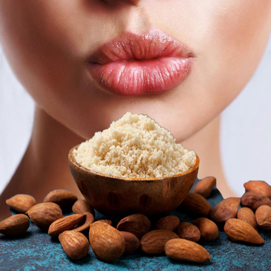 لتمليس الشفاه والتخلّص من الخلايا الميتة المتراكمة على سطحها يمكن الاستعانة بمقشّر طبيعي مصنوع من بودرة اللوز. يكفي تطبيق القليل من هذه البودرة على الشفاه المرطّبة بالماء وفركها لمدة دقيقة قبل شطفها بالماء الفاتر ثمّ تجفيفها وتطبيق نقطتين من زيت اللوز الحلو عليها للحصول على شفاه ناعمة جداً.