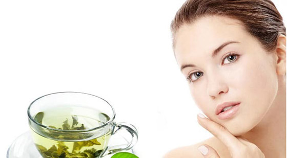 يحمي الشاي الأخضر البشرة من مضاعفات الأشعة فوق البنفسجية، سواء عن الطريق الداخلي عن طريق الشرب، أو إذا طبق موضعياً، ويدخل الشاي الأخضر في تركيب الكثير من المرطبات الصنعية، وكثيراً ما يستخدم في معالجة حالات الإكزيما، وحب الشباب.