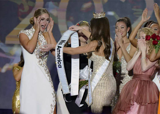 - ملكة جمال ويسكونسن غريس ستانكي، إلى اليسار ، تتسلم وشاح ملكة جمال أمريكا 2023 من قبل ملكة جمال أمريكا 2022 إيما برويلز، في المنتصف، بعد أن تم اختيار ستانك للفوز بالمسابقة في كازينو موهيغان صن، في أونكاسفيل، كونيتيكت، 15 ديسمبر/كانون الأول 2022.