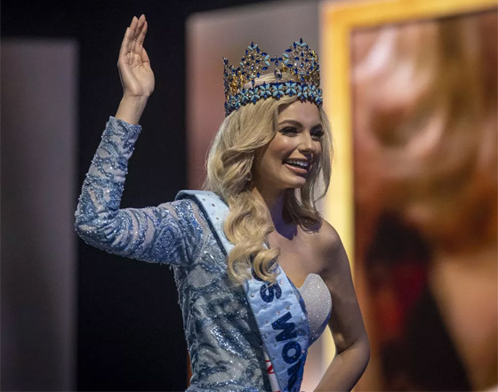 - ملكة جمال بولندا كارولينا بيلوسكا تلوح بيدها بعد فوزها بلقب "ملكة جمال العالم" رقم 70 في قاعة "كوكا-كولا ميوزيك هول" في سان خوان، بورتوريكو في 16 مارس/آذار 2022.
