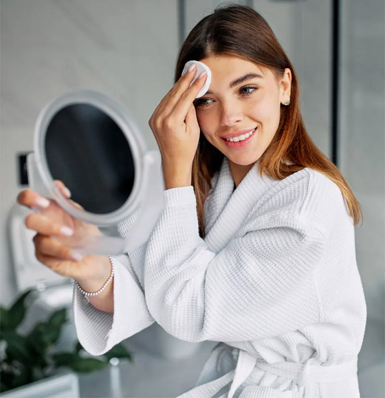 1- هل يجب تنظيف البشرة، حتى لو كانت خالية من الماكياج؟: يُعتبر تنظيف البشرة خطوة ضروريّة في الروتين التجميلي اليومي، حتى في حال عدم تطبيق الماكياج على البشرة. فهو يُساعد في إزالة الغبار، والتلوث، والإفرازات الزهميّة، والخلايا الميتة عن سطحها لتجنّب تأكسد هذه العناصر وتسبّبها بظهور بثور، احمرار، أو حتى تحسّس. المستحضر الأفضل في هذه الحالة هو ماء ميسيلير، وهو يُستعمل على دوائر قطنيّة يتمّ مسحها على البشرة قبل شطف هذه الأخيرة بالماء أو رشّها برذاذ المياه المعدنيّة.