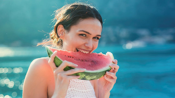 البطيخ فاكهة صيفية بامتياز، تبرد الجسم من الحرارة، وتمنحه الانتعاش، عدا طعم البطيخ الشهي، الذي يعد حضوره رئيسياً على موائد الطعام في فصل الصيف، إذ يفضل الناس تناوله، بعد أن ينتهوا من غدائهم أو عشائهم. ومعروف أن نسبة الماء في البطيخ تصل إلى 90% من مكوناته، وهو مفضل لاحتوائه على فيتامينات: (A.C.E)، كما تساهم بذوره في إزالة الخلايا الميتة عن سطح الجلد، ومن فوائد البطيخ المهمة، أنه يعزز إنتاج الكولاجين، ويحمي البشرة من الشيخوخة المبكرة، ويعد مثالياً لترطيب البشرة، وتعزيز حيوية الشعر.
