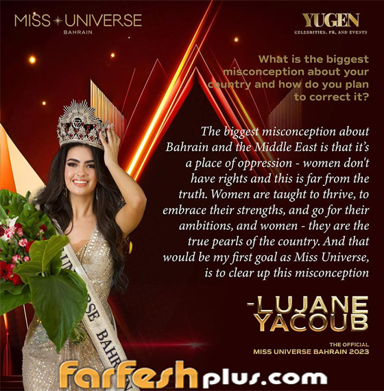 وكانت إجابتها: "أكبر فكرة خاطئة عن البحرين والشرق الأوسط هي أنهما مكانان للقمع، وفيهما لا تتمتع المرأة بأي حقوق. وهذا بعيد عن الحقيقة، يتم تعليم النساء كيف يزهرن ويحتضن نقاط قوتهن لتحقيق طموحاتهن، والنساء هن اللآلئ الحقيقية للبلاد. وسيكون هذا هو هدفي الأول كملكة جمال للكون، سأعمل على توضيح هذا المفهوم الخاطئ."