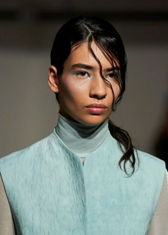 من المعروف أن الأزرق الفاتح هو أحد أبرز ألوان مكياج الربيع والصيف، لكنه سيكون استخدامه في المكياج مختلفاً هذه المرة، إذ أطلقت دار مايم كوروغوشي Mame Kurogouchi خلال عرضها في أسبوع الموضة الباريسي، موضة مكياج العيون اللماع باللون الأزرق الفاتح عند زاويتي العين الداخلية والخارجية، مع بريق لامع يمتد حول منطقة تحت العين.