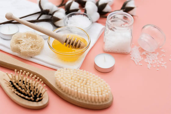 4- العسل وزيت جوز الهند: يعمل زيت جوز الهند على ترطيب الشعر من الجذور إلى الأطراف، وهو يعمل على تغذيته بالعمق وتعزيز لمعانه. يكفي تذويب مقدار 3 ملاعق كبيرة من هذا الزيت قبل إضافتها إلى 70 غراماً من العسل. يتمّ تدليك هذا الخليط على الشعر الرطب ويُترك لمدة 10 دقائق قبل شطفه بالماء الدافئ.