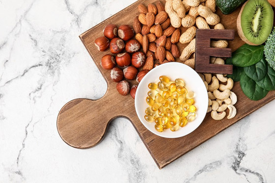 يعد فيتامين (E)، المعروف باسم فيتامين (هـ)، عنصراً غذائياً قابلاً للذوبان في الدهون، ويلعب دوراً في الحفاظ على صحة جيدة، فهو عبارة عن مجموعة مكونة من 8 مركبات مختلفة، بما في ذلك: التوكوفيرول، والتوكوترينول، المعروفة بخصائصها المضادة للأكسدة، وفيتامين (E) ضروري للعديد من وظائف الجسم، وقد تم ربطه بفوائد صحية مختلفة. ويساعد فيتامين (E) في الحفاظ على صحة الجلد، حيث يستخدم في منتجات العناية بالبشرة؛ نظراً لخصائصه المرطبة والعلاجية، ويساعد فيتامين (E) على حماية البشرة من الأضرار التي تسببها أشعة الشمس فوق البنفسجية الضارة، ما يقلل خطر حروق الشمس، وسرطان الجلد. بالإضافة إلى ذلك يساعد في إصلاح خلايا الجلد التالفة، ما يعزز بشرة أكثر شباباً وإشراقاً.