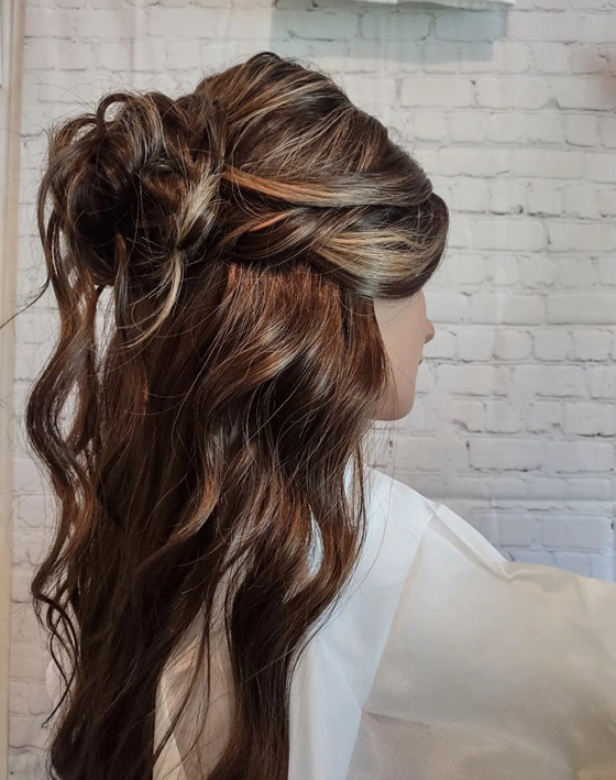 تحقق تصفيفة الشعر نصف المرفوع لأعلى توازناً رائعاً بين الأناقة الرسمية والسحر غير الرسمي، وهذا النمط الذي يسمح برفع النصف العلوي من الشعر للأعلى بينما يتدلى الباقي للأسفل، يوفر منصة للإبداع والتعبير الشخصي، كما أنه يفتح العديد من الاحتمالات لدمج عناصر مثل الضفائر والإكسسوارات.