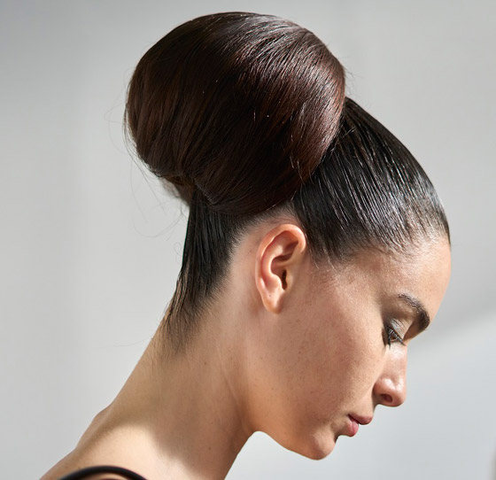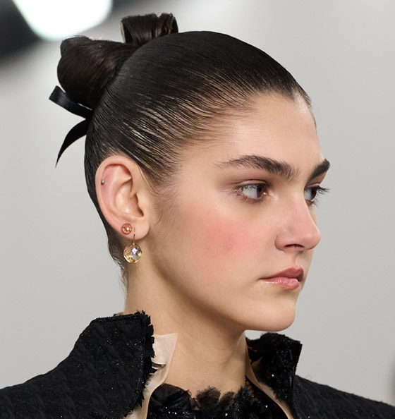 إلى ذلك، بإمكانك اختيار تسريحة شعر مرفوع على هيئة كعكة عالية مبعثرة، وتزيينها بشريط حريري أسود، كالتي برزت في عرض دار "فيكتور أند رولف" Viktor e Rolf في أسبوع الموضة الباريسي لربيع وصيف 2024. هذه التسريحة ناعمة وعصرية، ولا تتطلب وقتاً لتصفيفها، وستكون خياراً مثالياً لإطلالتك في عيد الأضحى.