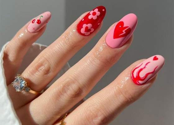 الأحمر والوردي من أبرز الألوان الخاطفة، فما بالكِ عند جمعهما معاً في تصميم طلاء أظافر واحد. سوف تمنحكِ هذه الإطلالة مظهراً خاطفاً وجذاباً مع مزيد من الأنوثة والنعومة، إذ إن اللون الأحمر يرمز للقوة والشغف، بينما الوردي الناعم يضيف لمسة أكثر رقة وجاذبية، لتحصلي على إطلالة راقية وأنيقة وناعمة.