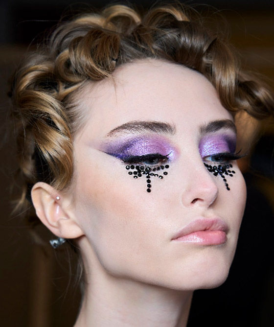 رسمات عيون بتدرجات لونية مشرقة مثل البنفسجي، كانت نجمة صيحات مكياج العيون لموسم ربيع وصيف 2024. هذه الألوان تنبض حيوية، وتناسب الأجواء الصيفية بامتياز. بإمكانك استخدام هذه الألوان كرسمات أيلاينر مجنحة أو كظلال عيون متدرجة على غرار عارضة دار جوليان فورني Julien Fournie في أسبوع الموضة الباريسي لربيع وصيف 2024، حيث تمّ تطبيق ظلال عيون بتدرجات البنفسجي، على طول الجفون الثابتة ومزجها بأسلوب فني، للحصول على لون ظلال عيون متدرج بين الفاتح عند زاوية العين الداخلية وظل داكن عند نهاية زاوية العين الخارجية، إلى جانب رسم خط أيلاينر باللون الأزرق الداكن بأسلوب مجنح، وتكثيف الرموش بالماسكرا. لإضافة لمسات فريدة على مكياجك، بإمكانك تزيينها بالستراس على هيئة دموع.